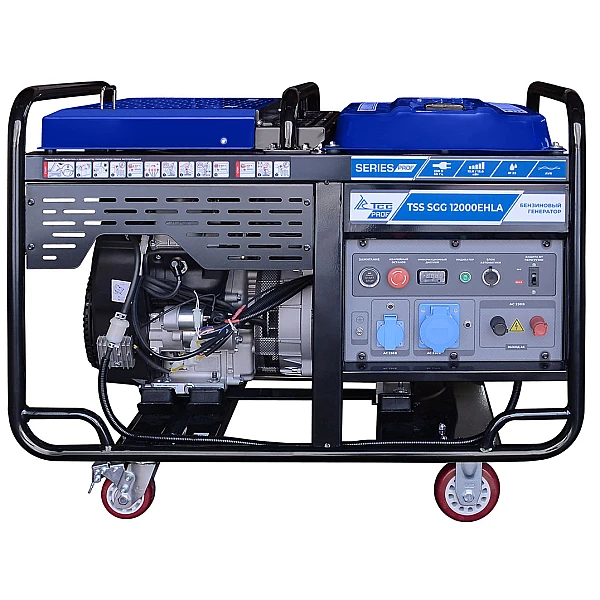 Бензиновый генератор TSS SGG 12000EHLA - мощная электростанция на 12 кВт с электростартером, которая позволяет реализовать различные варианты подключения нагрузки и отличается высокой мобильностью за счет колесного комплекта.