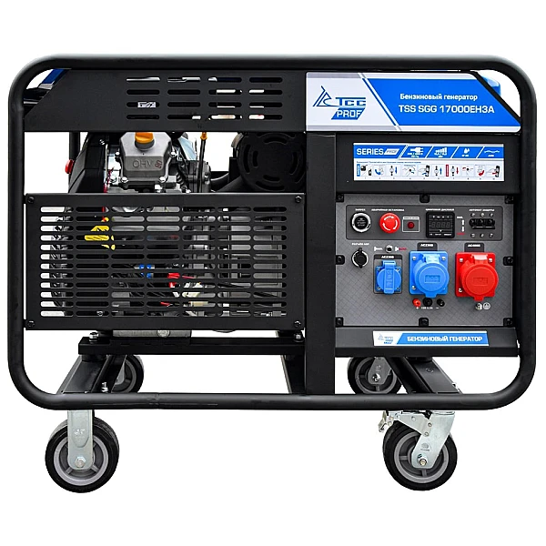Бензиновый генератор TSS SGG 17000EH3A - одна из самых мощных мобильных трехфазных установок бренда. Эта модель ориентирована исключительно на работу с высоконагруженными потребителями, которые рассчитаны на напряжение питания 380-400 В. Мощности 15.5 кВт будет достаточно для организации бесперебойного энергоснабжения оборудования промышленного класса - станка, подъемника, компрессора или насоса.