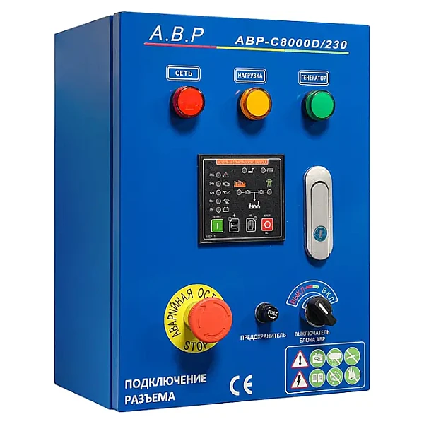 Блок АВР для дизельного генератора от 5 до 8 кВт/230 включает в себя систему автозапуска (автоматического ввода резервного электропитания). При появлении основного источника электропитания происходит отключение электростанции. Блок автоматического управления для контроля наличия напряжения в сети.