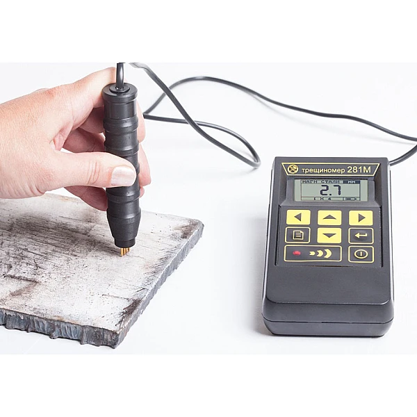 Трещиномер 281М - это высокоточный портативный прибор для измерения глубины трещин, выходящих на поверхность изделий из ферромагнитных металлов и сплавов (в т.ч. нержавейки, дюраля), предварительно обнаруженных каким-либо другим методом.