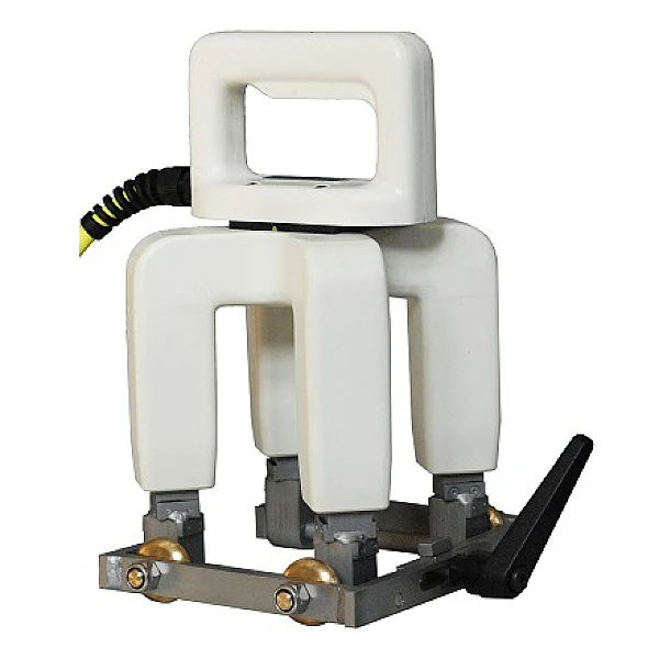 На проверяемую деталь магнитное поле прикладывают через небольшой воздушный зазор. Для этого 4 полюса электромагнита снабжены регулируемыми опорными колесами. Они обеспечивают постоянный воздушный зазор между полюсами и поверхностью проверяемой детали и, кроме того, позволяют легко передвигать электромагнит вдоль проверяемого участка.