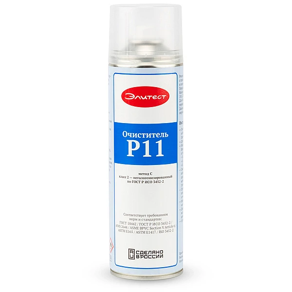 Согласно ГОСТ Р ИСО 3452-2 очиститель Элитест Р11 относится к методу C (на основе растворителя), классу 2 (негалогенизированный).