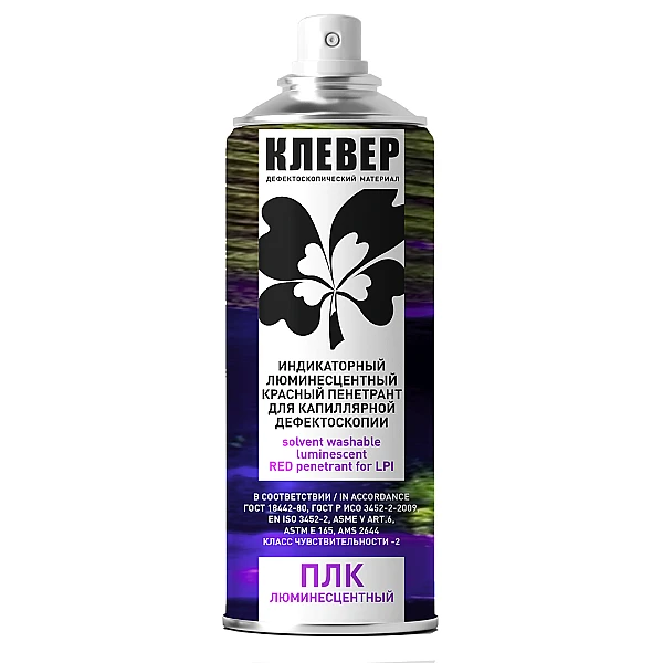 Красный флюоресцентный пенетрант КЛЕВЕР ПЛК сочетает в себе возможности цветного и люминесцентного капиллярного контроля.Смывается водой и растворителем.