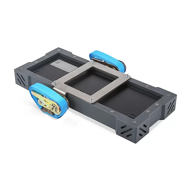 Ременное крепление ЭКО-10РК предназначено для позиционирования плоскопанельного цифрового детектора Экоскан 10 в защитном кожухе ЭКО-10У на цилиндрических объектах контроля. Состоит из стального основания и двух ремней-стяжек с храповым механизмом. Детектор в кожухе соединяется с основанием, а затем с помощью ремней устанавливается на объекте контроля.