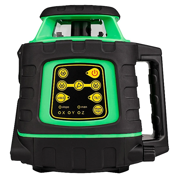 Угол сканирования лазерного луча можно сузить до 10, 45, 90 или 180°. Полученный отрезок линии можно перемещать, нажимая кнопки на приборной панели или пульте. Функция наклона ротационного нивелира AMO ROTOR 300G позволяет установить положение вертикальной или горизонтальной плоскости под точным углом для одной оси. При этом другая ось выравнивается автоматически. Роторный излучатель имеет три режима скорости вращения: 300, 500 и 800 об/мин.