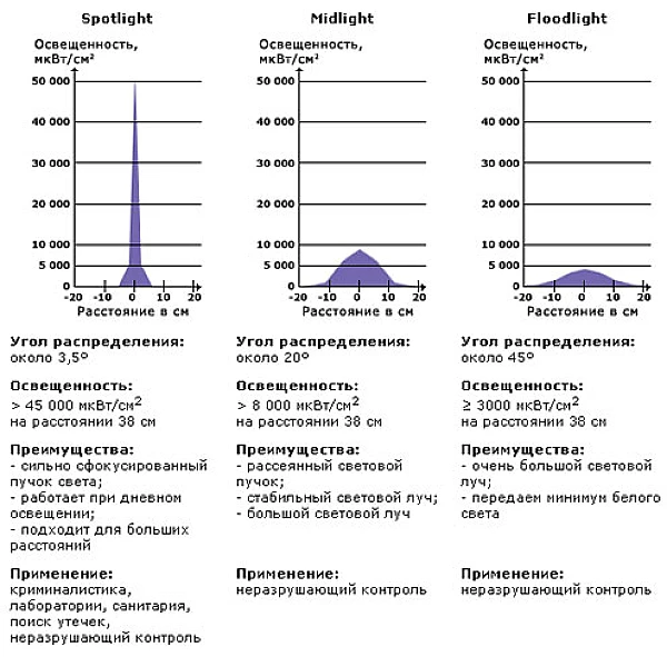 Внимание! Источники освещения применяемые в неразрушающем контроле обладают высокой мощностью излучения и предназначены исключительно для целей промышленного применения. Использование данных приборов в бытовых и медицинских целях недопустимо! В целях защиты оператора рекомендуется использовать специальные защитные очки. |